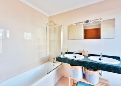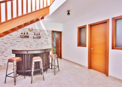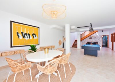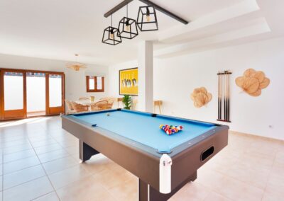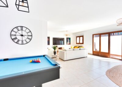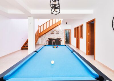 Dispone de aparcamiento gratuito dentro de la villa con puerta automática. La villa se divide en 2 plantas, en la primera planta encontrará una sala de estar con TV de 65 «, cocina americana, 2 dormitorios ambos con baños en suite, además de un aseo con lavabo e inodoro. En la planta baja hay 2 dormitorios más, una con cama matrimonial y otra con 2 literas, baño con ducha y bañera. Sala de billar, barra libre con bebidas ya incluidas en la estancia. Un segundo salón donde los 10 huéspedes podrán estar cómodos, ya que hay 2 sofás y 2 sillones. Concluye la parte de la planta baja mesa y sillas para jugar a las cartas o como zona para el teletrabajo y además un TV de 75″ con Netflix y Disney Plus.